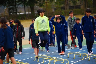 低学年は楽しく走る指導を受け、すっかり打ち解け。 |
